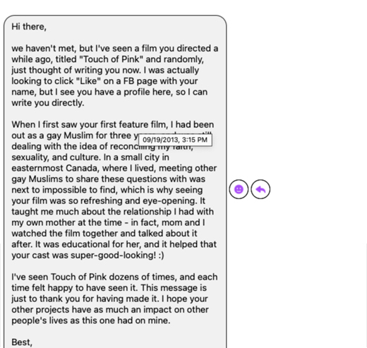 Reflecting on the possibilities for life in the midst of oppression and alienation in the introduction of the 1995 Queer Issue of Rungh, Rashid invited his readers to learn how “to speak in a radical accent, the popular language of our times, […] the language of pleasure, adventure, liberation, gratification and novelty.” In many ways, this quotation captures exactly what Rashid accomplished with TOUCH OF PINK (2004). The film imparted a diasporic vernacular of gay liberation that Rashid had developed during his time at Desh Pardesh in 1990s Toronto to gay Muslims and South Asians around the world. It offered a new grammar to make sense of those parts of life that were left unspoken and under-analyzed within South Asian diaspora families – sexuality and the body; violence and trauma; desire and imagination. Over the past twenty years, Rashid has regularly received thank you notes and messages of gratitude from film watchers around the world who have used the film's insights and particular dialect to powerfully re-shape their own lives for the better.